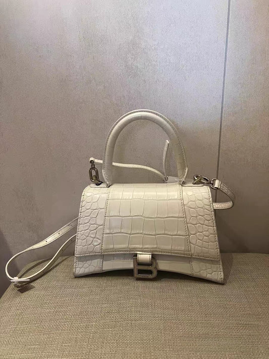 Balenciaga Hourglass XS White Crocodile-Embossed Leather Top Handle Bag