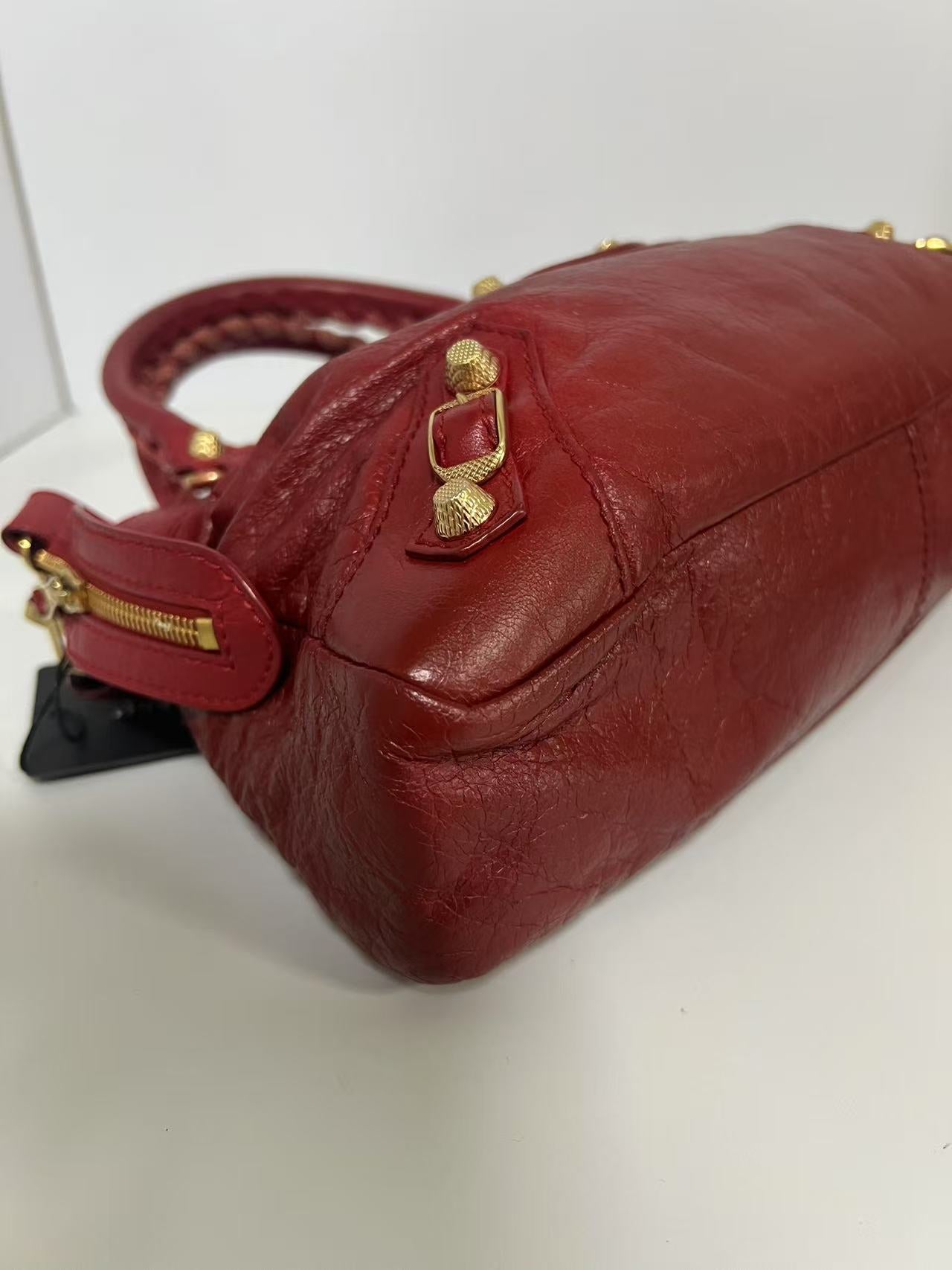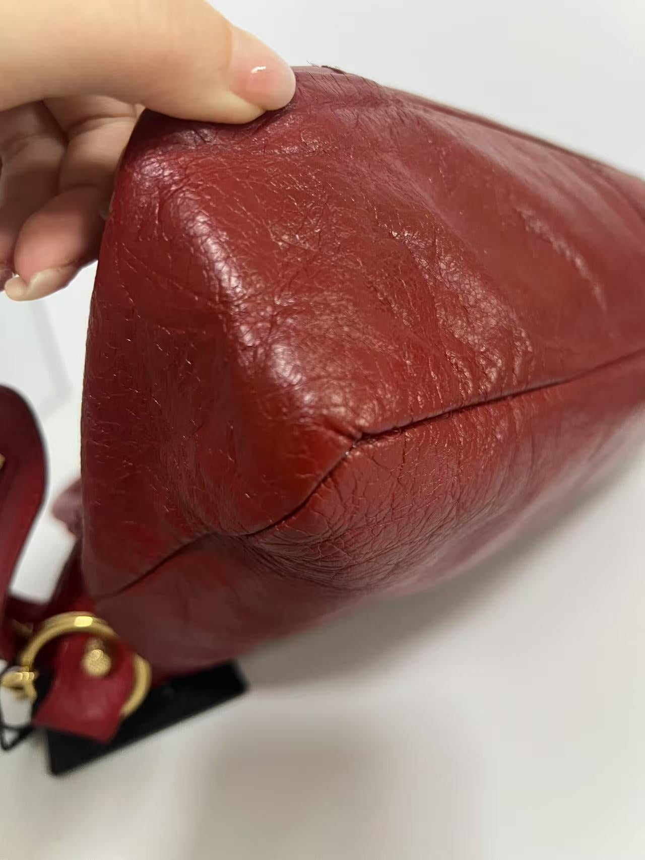 Features iconic crinkled/chevroned red leather with vintage gold-tone hardware, signature stud and buckle details, dual braided top handles, and an adjustable shoulder strap. The interior is lined with black fabric and includes a main compartment.