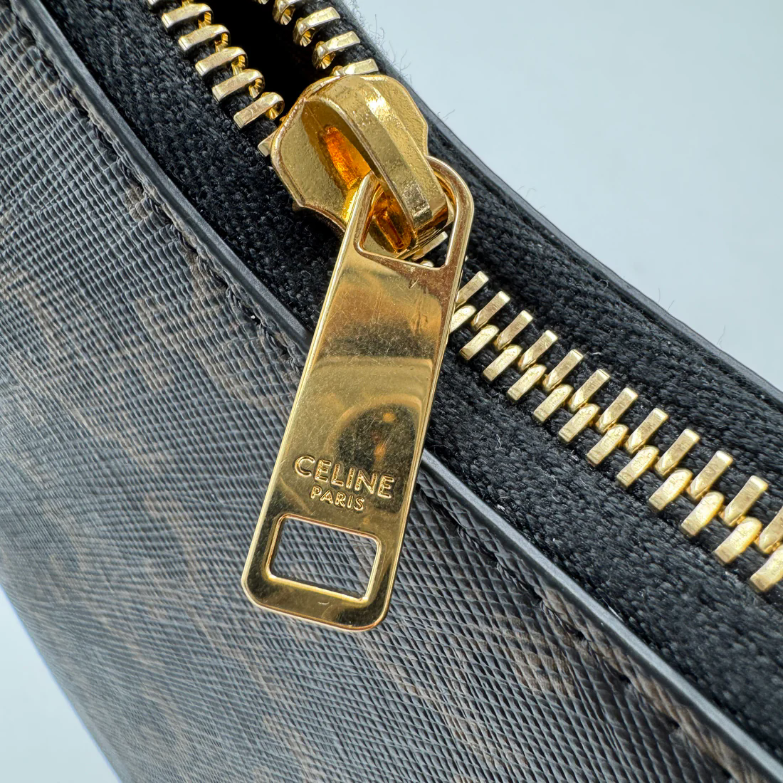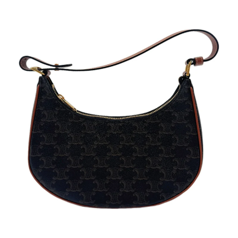 This is an authentic CELINE Triomphe Canvas Calfskin Ava Shoulder Bag in Tan. This chic bag is crafted of fine black coated canvas with brown leather trim. The bag features an adjustable leather strap with gold hardware. The top zipper opens to a brown fabric interior with a patch pocket.
