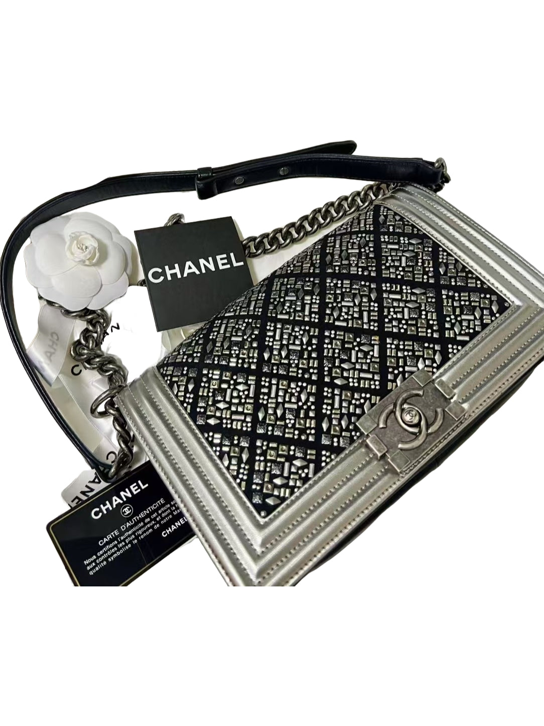 Chanel Boy Medium Black with Silver Studded Embellishments Bag