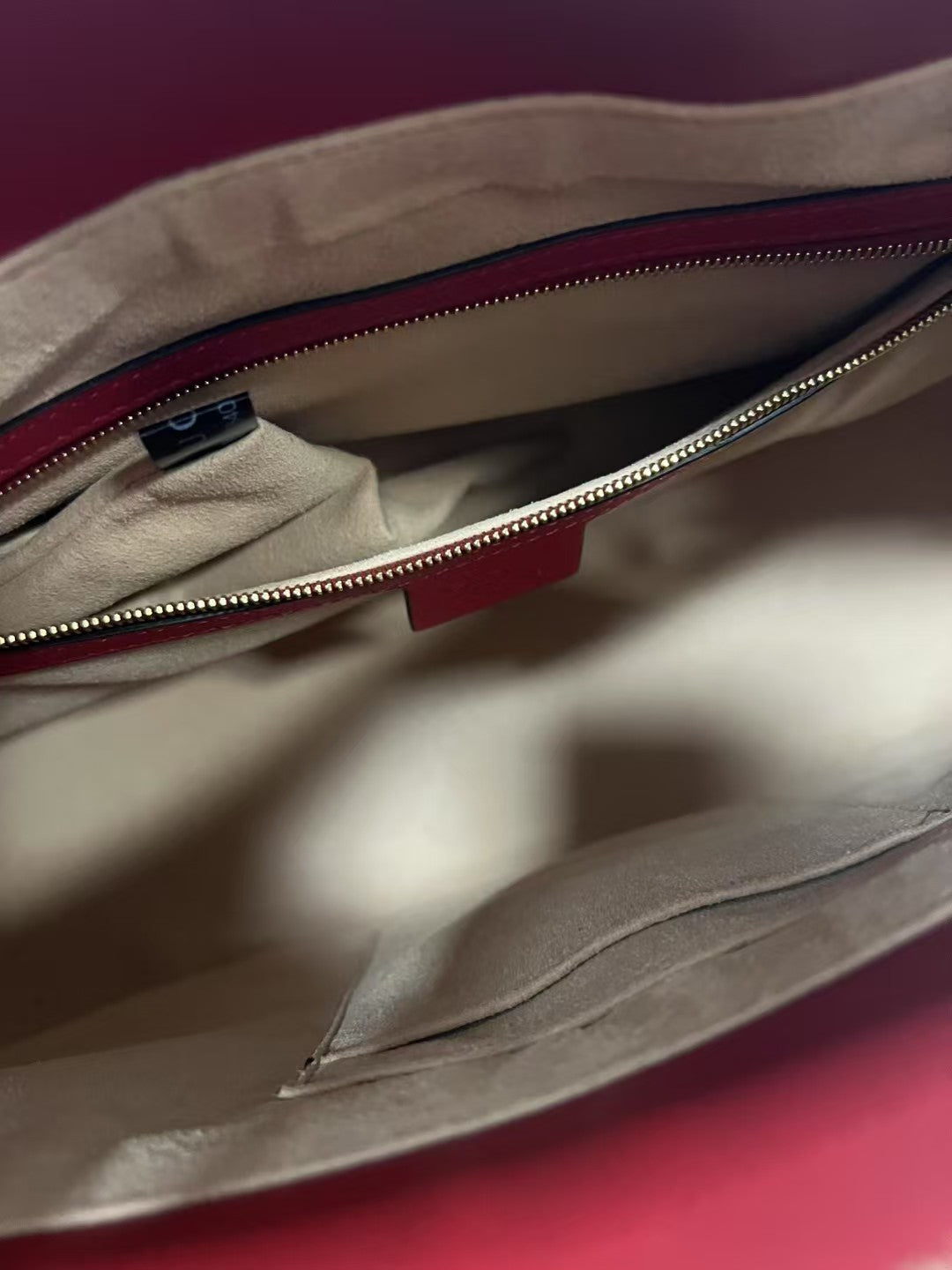 Features iconic GG monogram coated canvas with vibrant blue floral blooms print, contrasted by smooth red leather top handles, trim, and gold-tone hardware accents.