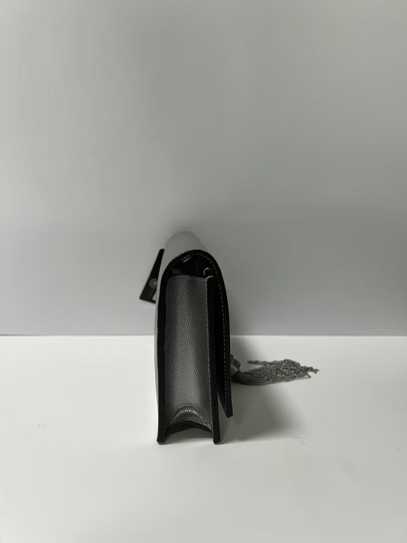 Iconic silver metallic leather with polished silver-tone hardware and the signature YSL tassel charm.